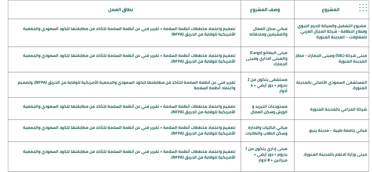 • تقارير مطابقة أنظمة السلامة مع كود البناء السعودي ومعايير NFPA.